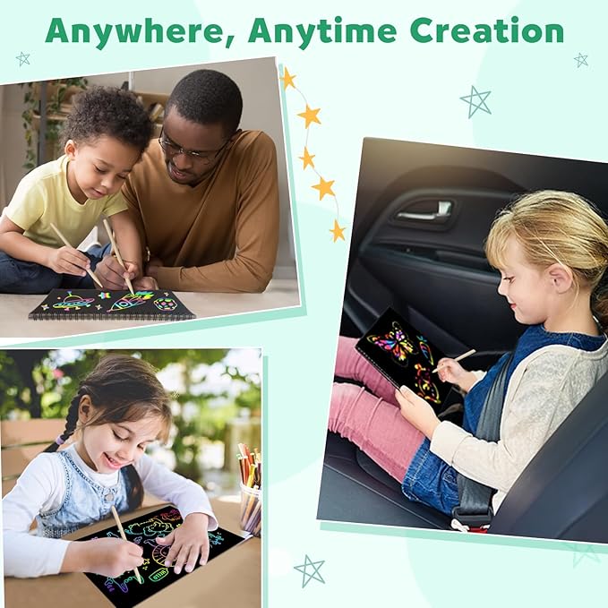 • Magic Rainbow Scratch Books: Include 20 spiral-bound pages & 4 styluses & 4 drawing stencils in scratch paper sets. The underlying color is bright, which is a great contrast to the black scratch-away material. Large art paper create a full size creation and your favorite patterns freely