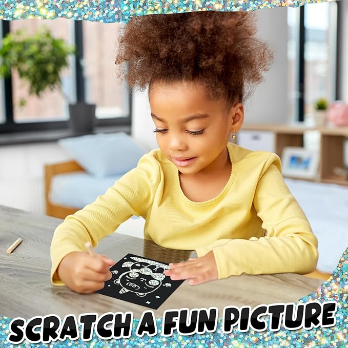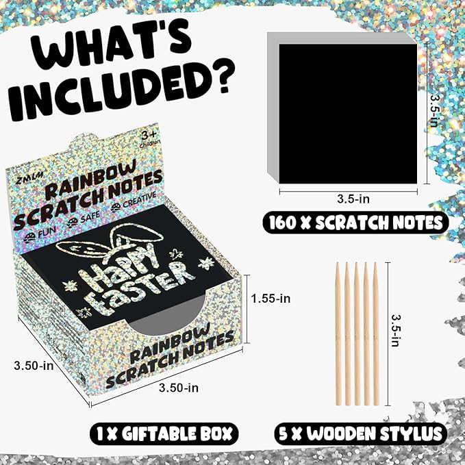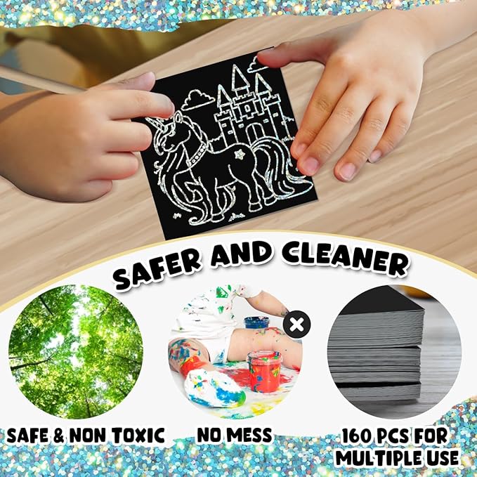 • Silver Scratch Art Mini Notes: Our scratch art paper with 160 sheets of holographic scratch paper note cards (Size: 3.5*3.5inch /8.5*8.5cm) and 5 Styluses(3.5inch/8.5cm). Super Bulk kids art craft kits for fun way to doodle, leave notes, write Lists and and create cool illustrations and designs. Both kids and adults love exercising their imaginations with this bulk art craft gift