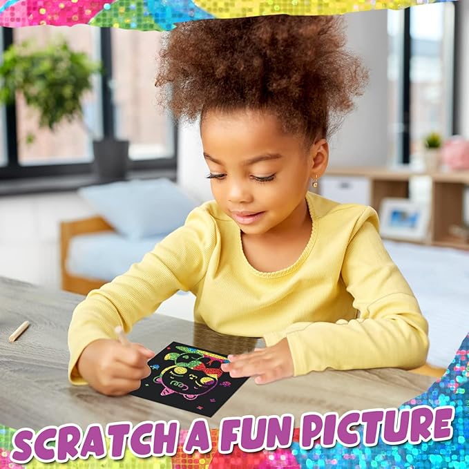 • Create Sparkling Amazing Artwork: The rainbow scratch art notes is covered with rainbow glitter holographic layer. Just scratch away the black matte surface and the holographic materials will flash different dazzling colors and luster at different angles under the sun or light. This scratch paper art let kids take the time to play, think, and create their masterpieces
