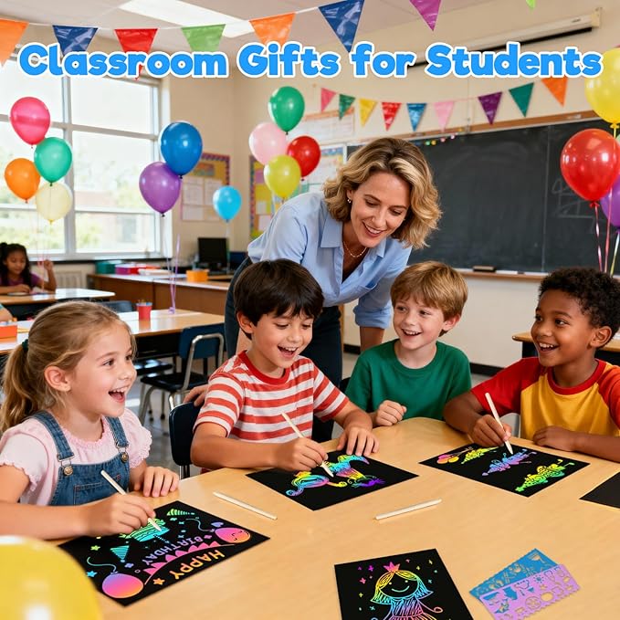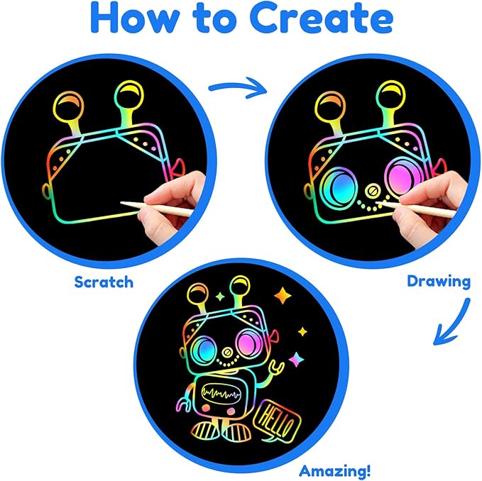 • Creative Boys & Girls Holiday Gifts - The creativity of this black scratch paper and the beautiful packaging makes it a great arts and crafts for kids bulk.Ideal gifts for kids birthday party favors, class activity and Valentine day, Easter Basket Essentials, Halloween, Children's day, Thanksgiving, Christmas and Stocking Stuffers.